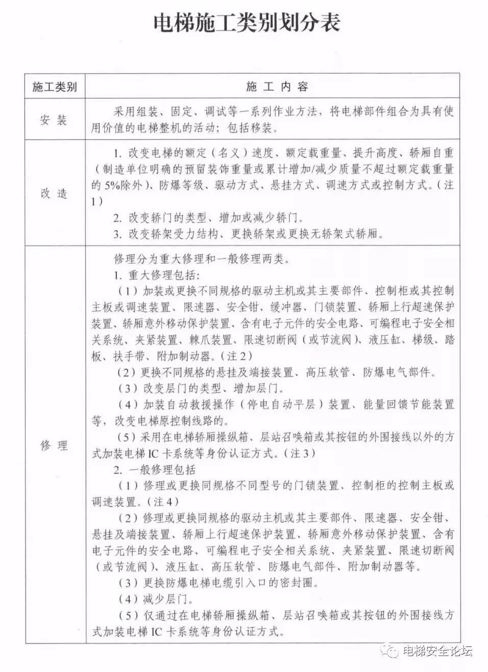 2.将原改造内容进行大幅度下放调整为重大修理项目,仅保留“改变星空(中国)的额定(名义)速度、额定载重量、提升高度、轿厢自重(制造单位明确的预留装饰重量除外)、防爆等级、驱动方式、悬挂方式、调速方式以及控制方式”和“改变轿门的类型、增加或减少轿门”部分。根据《特种设备生产单位许可目录》调整情况,改造能力要求与制造能力要求相同,但是对于确实可以由施工单位进行的工作,调整为修理项目后,一方面保证可以由施工单位进行的施工内容仍然交给施工单位,另外一方面,对于重要施工内容可以通过检验来考核施工质量。